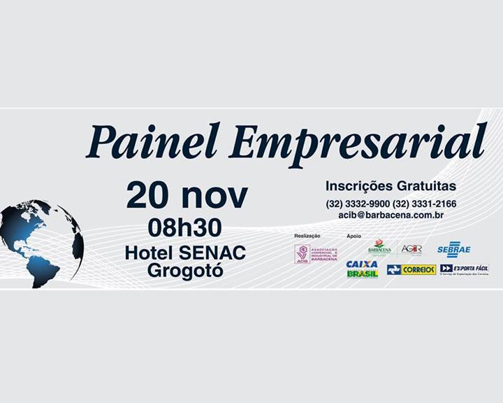 A Prefeitura Municipal de Barbacena, através da Diretoria de Fomento Econômico da AGIR, em parceria com a Associação Comercial de Barbacena (ACIB), realiza o Painel Empresarial. Na quarta-feira, 20 de novembro, a partir das 8h30, o Hotel SENAC Grogotó recebe o evento, que conta com o apoio do SEBRAE, Correios e Caixa Econômica Federal.