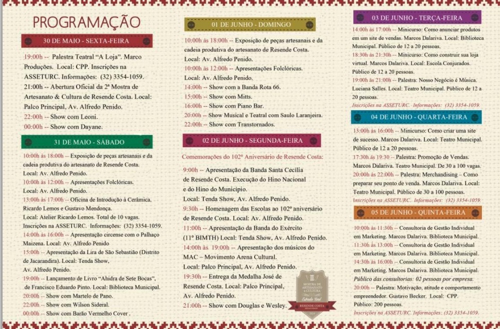 Palestras, exposições, mini-cursos, consultorias, oficinas, apresentações teatrais e grandes atrações da Música Brasileira. Vem aí a II Mostra de Artesanato e Cultura de Resende Costa. De 30 de Maio a 02 de Junho. Algumas atividades oferecidas pelo SEBRAE se estenderão até a semana posterior. Não fique fora dessa!