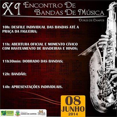 A Prefeitura Municipal de Dores de Campos tem o prazer de convidar você e sua família para o XI Encontro de Bandas de Música, que acontecerá no dia 08 DE JUNHO DE 2014, no ESPAÇO CULTURAL "FIGUEIRA ENCANTADA".