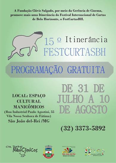 Com produção da Cia. Teatral ManiCômicos e Prefeitura de São João del-Rei, por meio da Secretaria Municipal de Cultura, Turismo, Esporte e Lazer, acontece entre os dias 31 de agosto e 10 de julho a Itinerância do 15º Festival de Curtas de Belo Horizonte.
