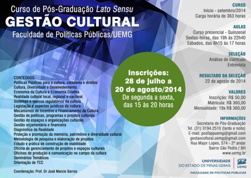 Curso de Pós-Graduação Latu Sensu - Gestão Cultural - UEMG . Inscrições até 20/08