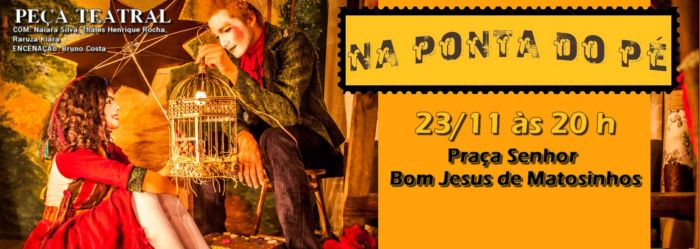 Hoje tem ensaio aberto da peça teatral "Na Ponta do Pé", às 20h, na Praça Bom Senhor de Matosinhos.