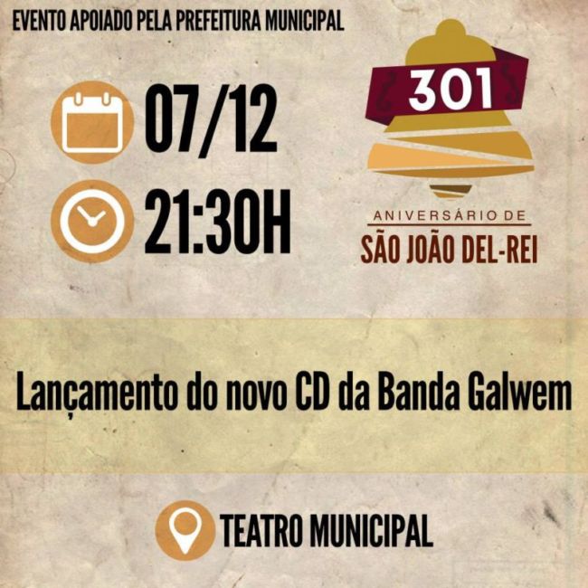 Lançamento CD Banda Galwem . Evento 300 anos +1 . SÃO JOÃO DEL-REI COMPLETA 301 ANOS DIA 8 DE DEZEMBRO