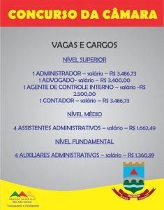 "Esses são os cargos com os respectivos rendimentos criados através do Projeto de Lei 6793, aprovado na última terça-feira (17). A partir de agora, a Casa vai realizar o edital para contratação da empresa responsável pelo Concurso Público. Esta será a primeira vez que a Casa Legislativa realiza um Concurso em sua história."