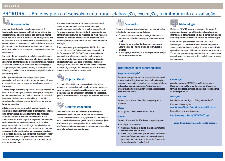 O Centro Internacional de Formação da OIT anuncia que estão abertas as inscrições para participar na segunda edição do curso a distância do Programa Delnet em: PRORURAL - Projetos para o desenvolvimento rural: elaboração, execução, monitoramento e avaliação (português e espanhol)