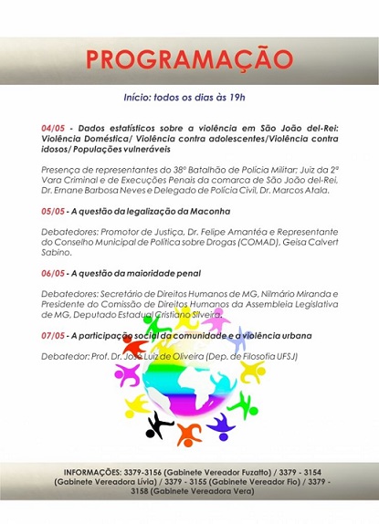 1º Seminário de Segurança Pública da Câmara Municipal de São João del-Rei, através da Escola do Legislativo. O evento acontece entre os dias 4 e 7 de maio, no Plenário da Câmara.
