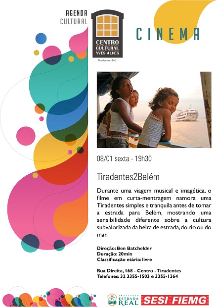 As sessões gratuitas de cinema serão retomadas na noite de 08.01, sexta, às 19h00, com o documentário Restauração, deJoão Batista da Silva, sobre a restauração das lanternas de prata da Matriz de Santo Antônio, seguido deTiradentes2Belém, uma mostra das imagens produzidas durante a viagem do fotógrafo e escritor Ben Batchelder.