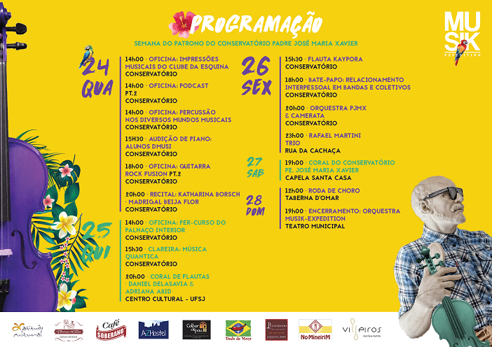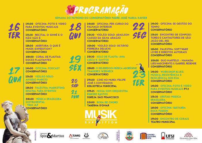 De 16 a 28 de agosto, o Instituto Spix & Martius em parceria com o Forno Harmônico realiza a MUSIK-Expedition, primeira Expedição Musical em São João del Rei e que homenageia o compositor Pe. José Maria Xavier, patrono do Conservatório Estadual de Música. O festival, produzido de forma colaborativa, conta com a participação de músicos internacionais e artistas de várias instituições musicais da região, formando uma grande orquestra, e oferecerá duas semanas de oficinas de coral e orquestra, palestras, workshops de gestão cultural e produção de audiovisual, além de recitais e concertos.