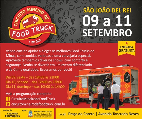 Nos próximos dias 09 a 11 de setembro acontecerá em São João Del Rei uma etapa do Circuito Mineiro de Food Truck. A cidade recepcionará a primeira etapa do evento, cujo objetivo é levar a diversas cidades do estado a cultura gastronômica em food trucks.