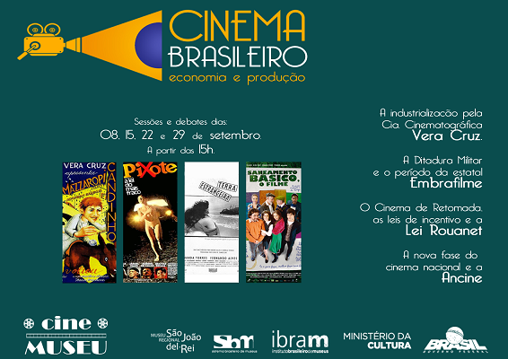 O Museu Regional de São João del-Rei realiza, durante o mês de setembro, a mostra “Cinema Brasileiro – Economia e Produção”, como parte da 10ª Primavera de Museus do Ibram. Serão quatro sessões cinematográficas abertas ao público geral, com filmes produzidos por diferentes meios de financiamento, ao longo de diversos períodos da história do cinema nacional. Cada sessão será seguida de palestra relacionada ao período de produção do longa-metragem, com a emissão de certificados de participação ao final do mês.
