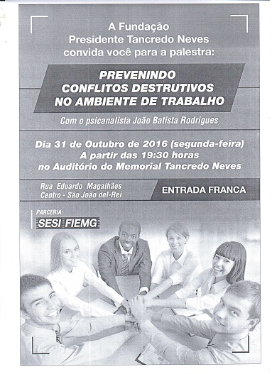 A Fundação Presidente Tancredo Neves tem a satisfação de convidá-los para uma palestra que será proferida no próximo dia 31 (segunda-feira), no auditório da sua sede, à Rua Eduardo Magalhães, centro, São João del-Rei.