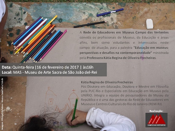 A Rede de Educadores em Museus (REM Campo das Vertentes) convida os profissionais de Museus, da Educação e áreas afins, bem como estudantes e interessados neste campo de atuação, para a palestra "Educação em museus: perspectivas e desafios na contemporaneidade" ministrada pela Professora Kátia Regina de Oliveira Frecheiras.