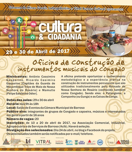 Estão abertas, até o dia 20 de abril, as inscrições para a oficina de construção de instrumentos musicais do congado. As inscrições estão sendo feitas, gratuitamente, na Associação Comercial, Industrial, Agropecuária e de Serviços de Barroso – ACIB, na Rua Daniel Pantaleão Ferreira, 144, Centro, Barroso/MG, de 2ª a 6ª feira, das 9h às 18h. Os interessados também podem solicitar a ficha pelo e-mail culturaecidadaniabso@gmail.com