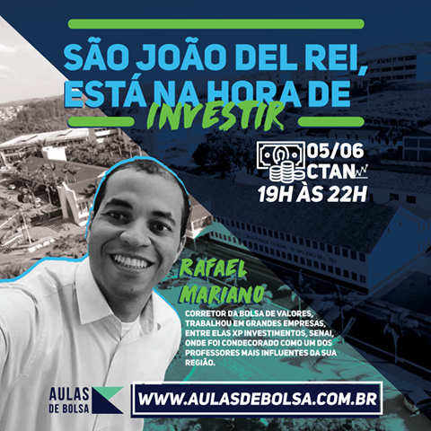 A palestra gratuita "Entendendo a Bolsa de Valores" busca trazer ao público são-joanense - e da região das vertentes, de modo geral - os conhecimentos de base do mercado financeiro. O palestrante, Rafael Mariano, ensinará os primeiros passos na hora de investir, partindo de sua própria experiência, e dando conselhos que foram relevantes em toda a sua trajetória no mercado de ações.