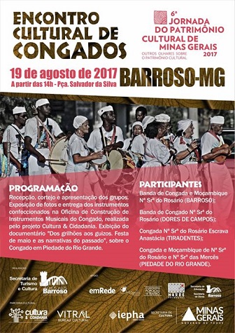 A Secretaria de Turismo e Cultura promove, no próximo sábado (19), o Encontro Cultural de Congados. O evento, que faz parte da 6ª Jornada do Patrimônio Cultural de Minas Gerais, será realizado na Praça Salvador da Silva, a partir das 14 horas e vai reunir os grupos de Congado de Barroso, Dores de Campos, Tiradentes e Piedade do Rio Grande. Confira a programação: