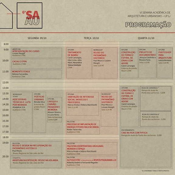 A VI Semana Acadêmica do curso de Arquitetura e Urbanismo da UFSJ propõe a discussão sobre o fazer arquitetônico, como meio de produção da cidade e do suporte material da memória. Processos digitais e analógicos que convivem no tempo e no espaço urbano em prol do humano. A arquitetura do novo e do velho, ou do novo no velho. A técnica milenar e a nova, lado a lado, fazendo parede, casa, arquitetura, cidade, gente. Espaço de retomada, de continuidade e de reflexão para participar, conhecer, ouvir e fazer. Palestras, workshops, mesa-redonda e atividades, de dentro e de fora, dentro e fora da academia.