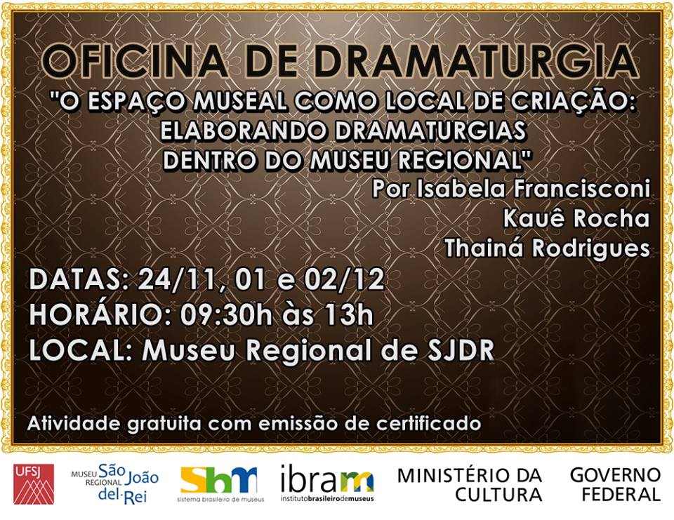Neste sábado (24) começam as oficinas dos alunos do curso de Teatro da UFSJ, aqui no Museu Regional. A intenção é criar texto dramatúrgicos através de uma visão lúdica sobre o acervo museológico.