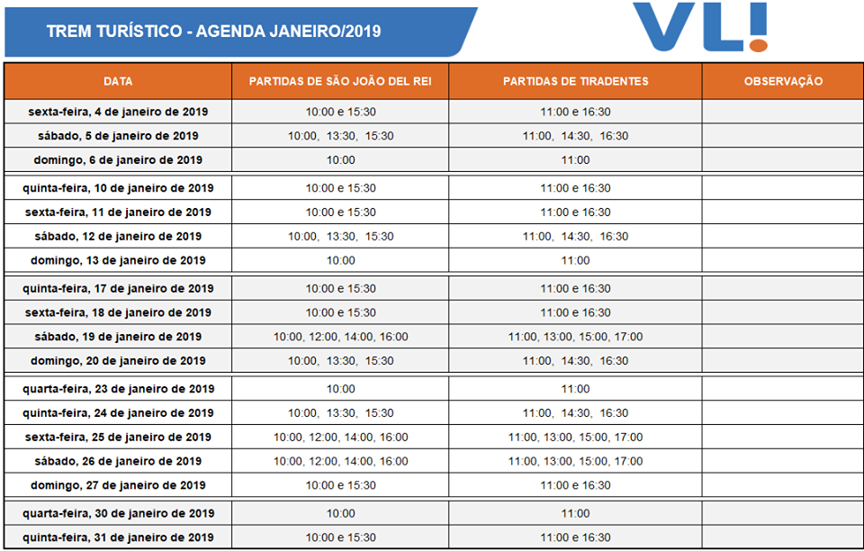 Horários da "Maria Fumaça" para o Mês de Janeiro . 2019