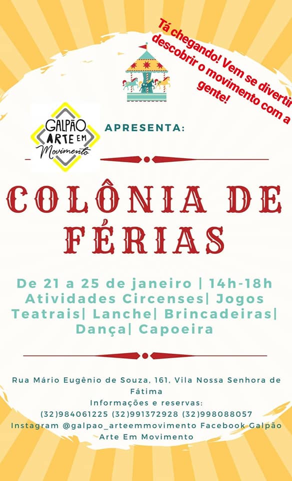 Colônia de Férias . Galpão Arte em Movimento . De 21 a 25 de Janeiro . 2019