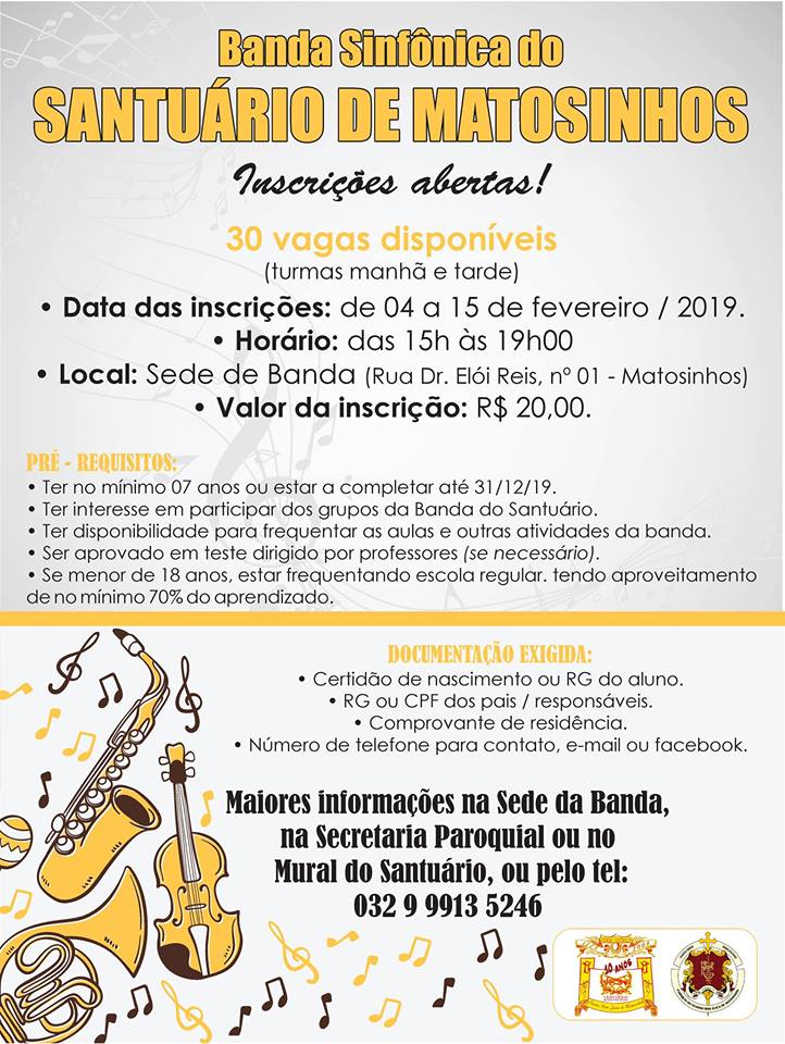 Inscrições para a "Banda Sinfônica do Santuário do Senhor Bom Jesus de Matosinhos" . De 04 a 15 de fevereiro . 2019