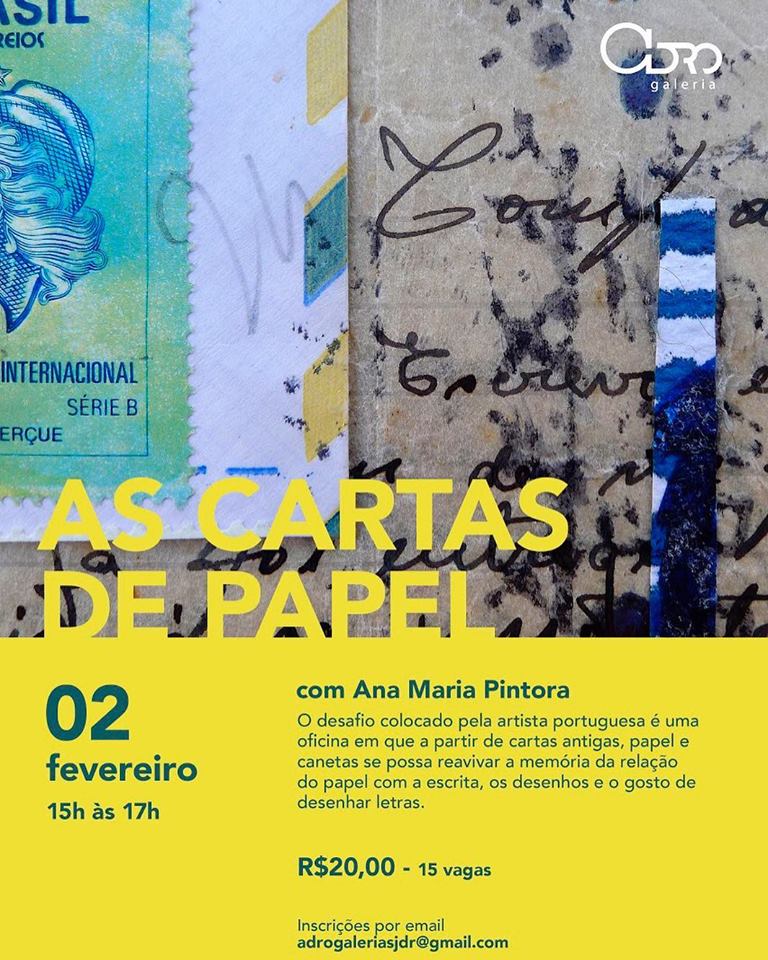 A partir de um imaginário da correspondência entre Portugal e o Brasil, a pintora Ana Maria criou um conjunto de desenhos, intervenções em cartas de caligrafia autêntica e selos originais. O desafio que se coloca é criar uma oficina em que a partir de cartas antigas, papel e canetas se possa reavivar a memória da relação do papel com a escrita, os desenhos e o gosto de desenhar letras.