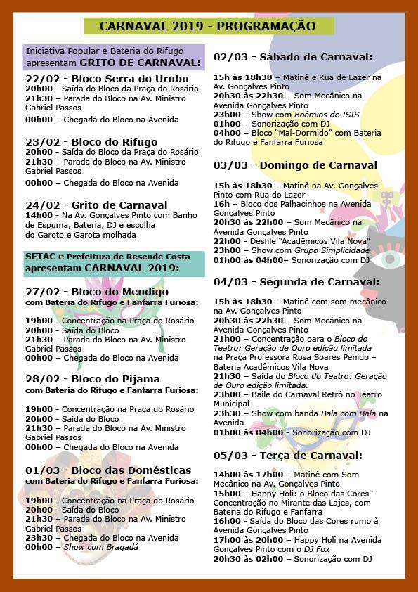 Carnaval de Resende Costa . De 22 de fevereiro a 05 de março . 2019