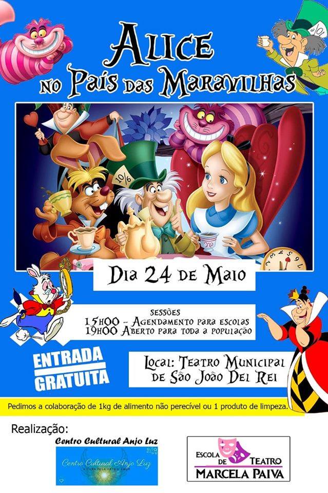 Convidamos a todos para a apresentação do espetáculo infantil “Alice no país das Maravilhas”, direção e adaptação por Marcela Paiva baseada na obra original de Lewis Carrol escrita em 1865 para a população sanjoanense, visto que, os atores são crianças e jovens que fazem parte do Centro Cultural Anjo Luz.