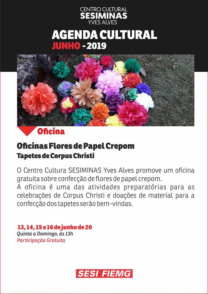Oficina Confecção Flores de Papel Crepon e Tapetes de Corpus Christi . Centro Cultural SesiMinas Yves Alves . Dias 13, 14 15 e 16 de junho 2019
