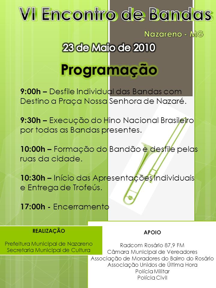 O encontro começa às 9h do dia 23 de maio, com desfile de bandas pelas principais ruas da cidade. Às 9h30, está prevista a execução do Hino Nacional com as bandas presentes. Às 10h, haverá a formação do bandão e desfile pelas ruas da cidade. Às 10h30, começarão as apresentações individuais. A previsão é que o evento seja encerrado às 17h. O Encontro é uma realização da prefeitura de Nazareno.
