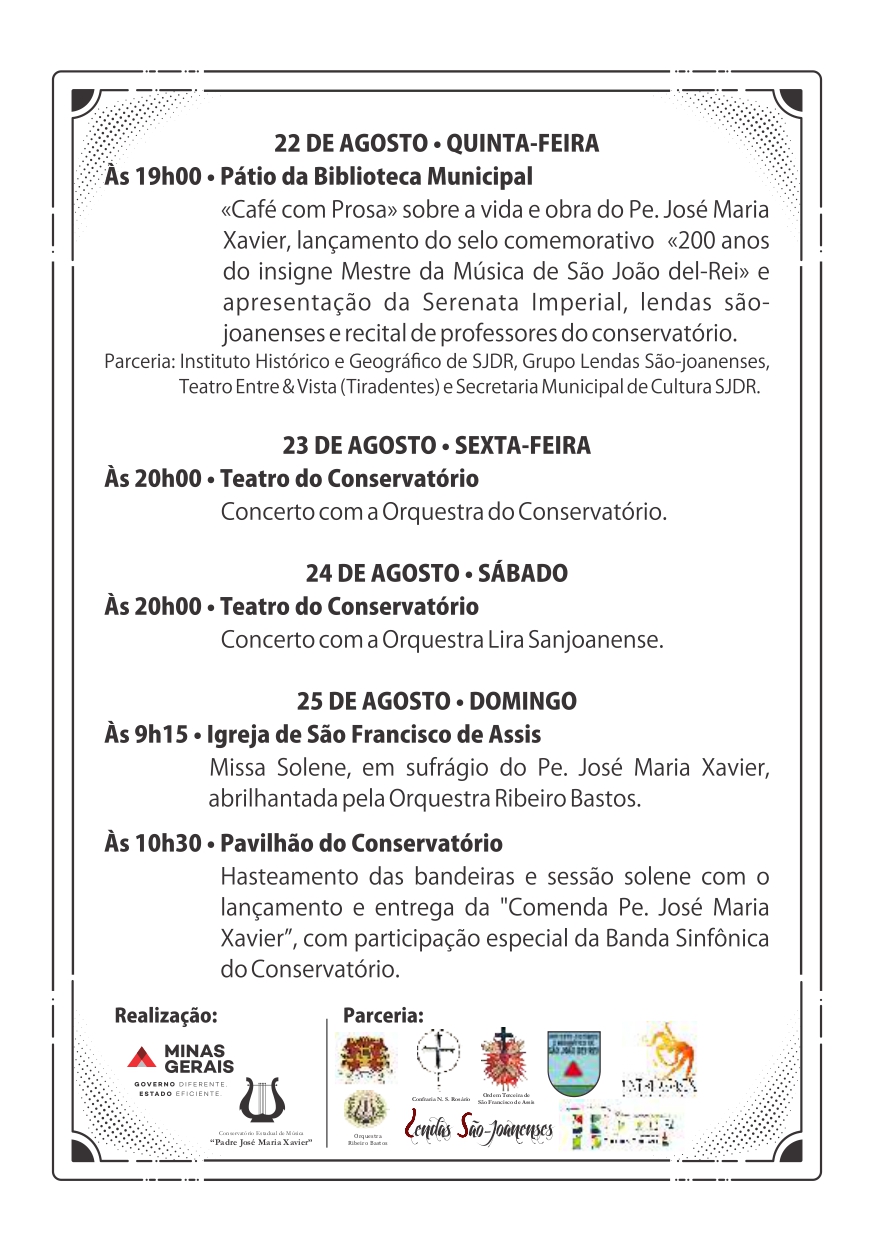 Semana do Patrono . Conservatório Estadual de Música Pe. José Maria Xavier . Programação Completa de 18 a 25 de agosto . 2019