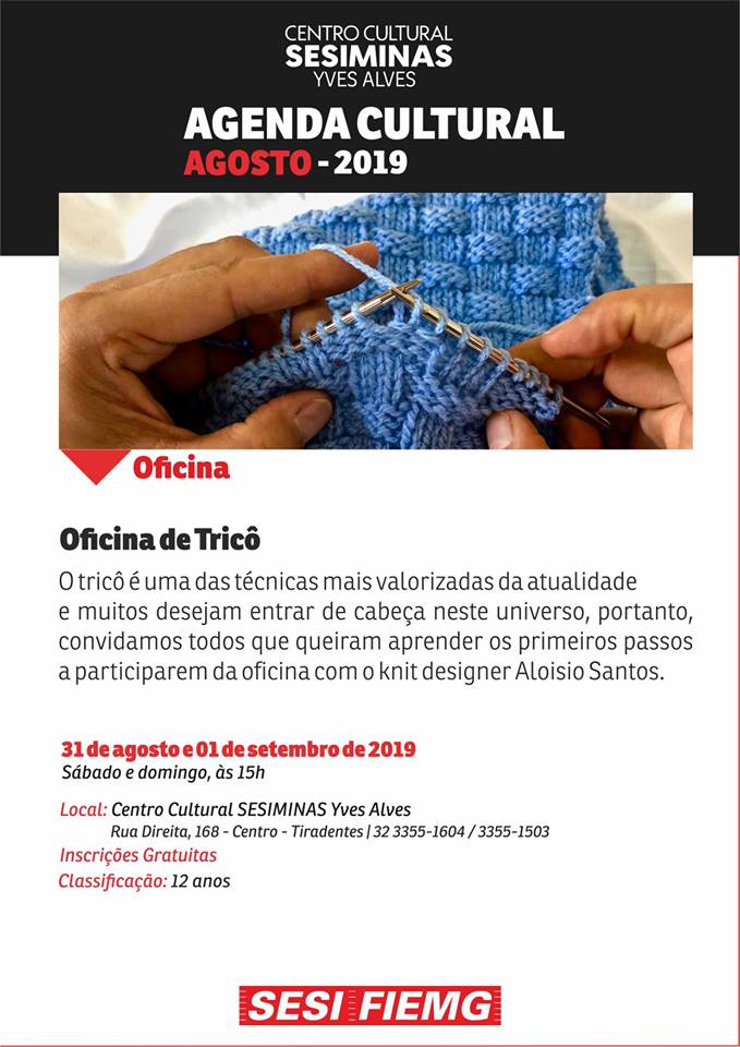 Oficina de Tricô . Centro Cultural SesiMinas - Yves Alves . De 31 de Agosto a 01 de Setembro . 2019