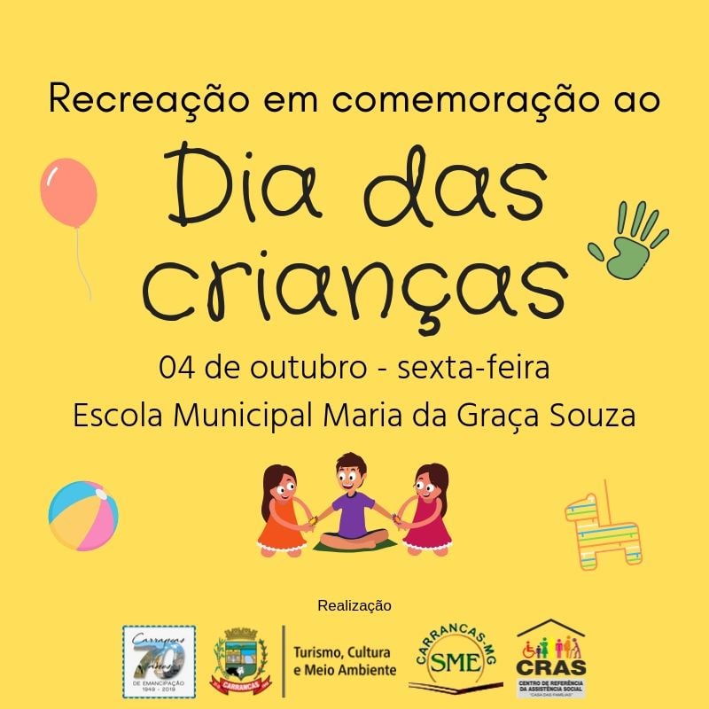A Secretaria Municipal de Turismo, Cultura e Meio Ambiente de Carrancas, em parceria com a Secretaria Municipal de Educação de Carrancas e CRAS Carrancas, realiza uma recreação em comemoração ao Dia das Crianças. Serão diversos brinquedos, entre tobogãs e futebol de sabão, com algodão doce e pipoca garantidos!