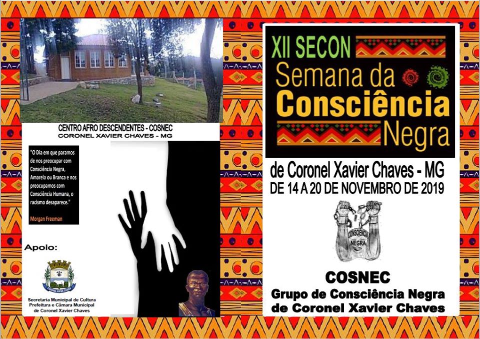 De 14 a 20 de Novembro de 2019 acontecerá em Coronel Xavier Chaves a Semana da Consciência Negra (SECON). O evento, organizado pelo Grupo de Consciência Negra (COSNEC) com o apoio da Secretaria de Cultura e da Câmara Municipal, traz como tema este ano “Heróis negros e o apagamento de sua história”.