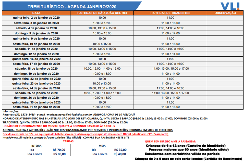 Horário da "Maria Fumaça" para o mês de Janeiro . 2020