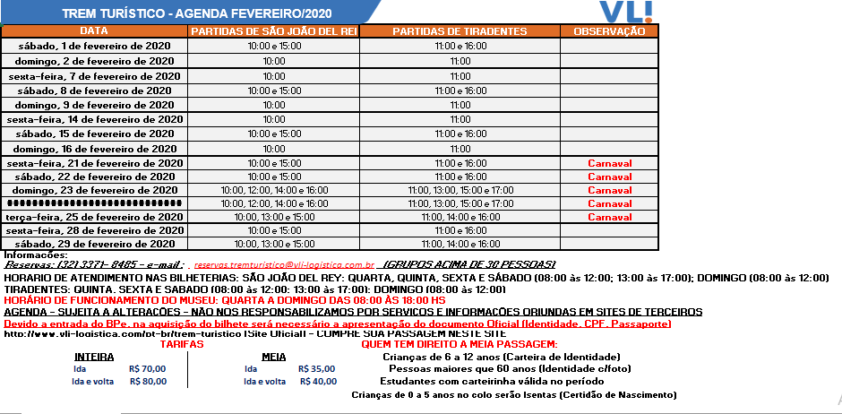 Horários "Maria Fumaça" . Estrada de Ferro Oeste de Minas . VL! . Fevereiro de 2020 .