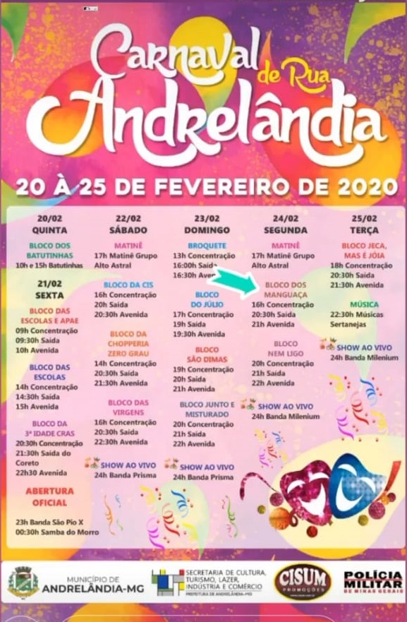 Carnaval de Andrelândia . De 20 a 25 de Fevereiro . 2020
