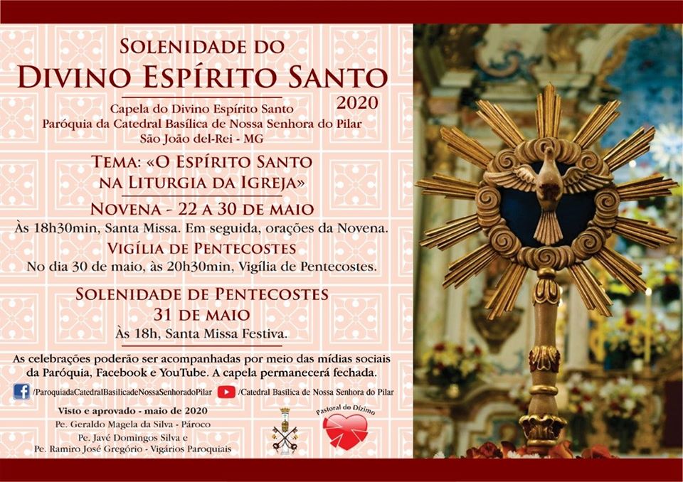Solenidade do Espírito Santo . Novena de 22 a 31 de maio . Ao vivo pelo facebook Paróquia da Catedral Basílica de Nsra do Pilar . 2020