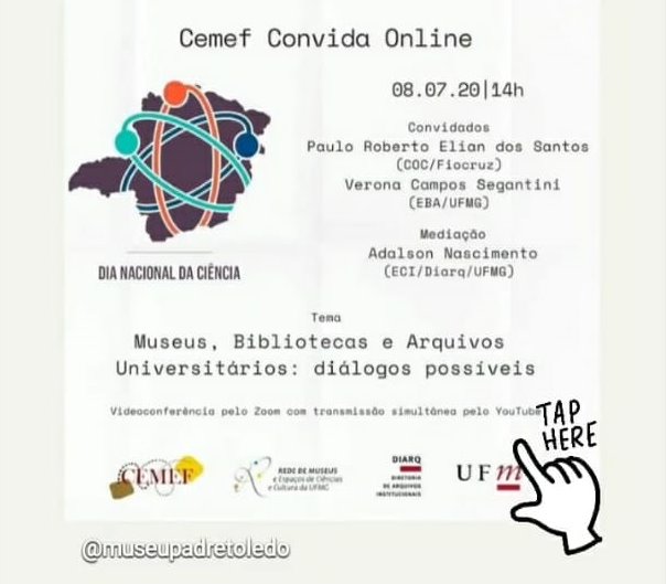 Live "Museus, Bibliotecas e Arquivos Universitários: diálogos possíveis " . Dia Nacional da Ciência . Canal Youtube Cemef/UFMG . 2020