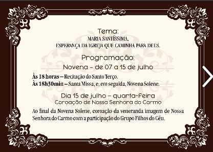 Festividades em honra à Nossa Senhora do Carmo . Programação completa de 07 a 15 de julho . Facebook e canal no Youtube Ordem Carmelita . 2020