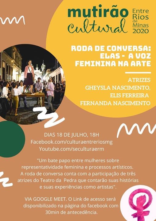 Live "Roda de Conversa: Elas- a voz feminina na arte" . Teatro da Pedra . Mutirão Cultural Entre Rios de Minas . Facebook Sec. Cultura, Esporte e Lazer . 2020