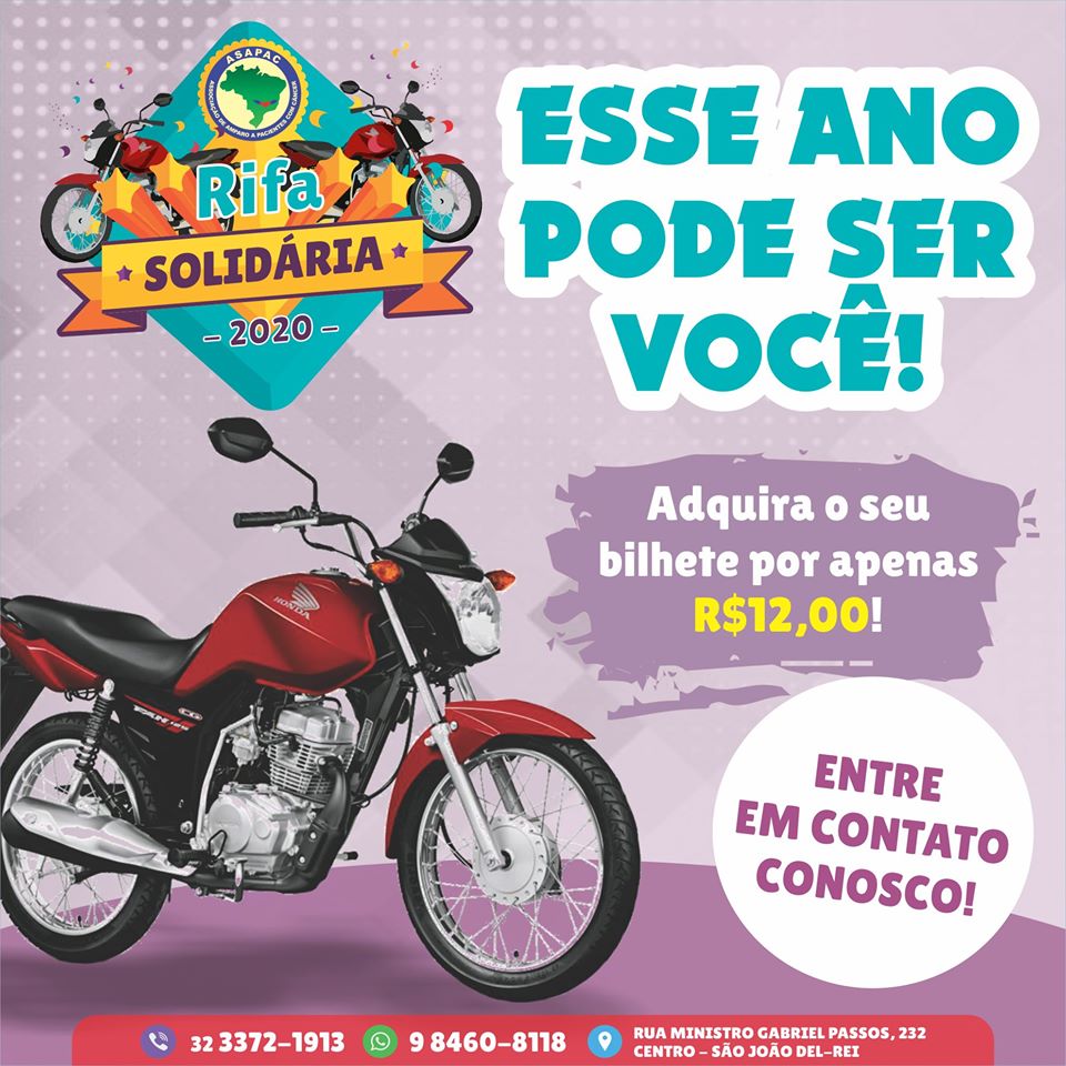 Por apenas R$12,00 você adquire o seu bilhete da nossa Rifa Soldiária e além de ajudar a ASAPAC, ainda concorre a duas motos CG START 160 0KM.