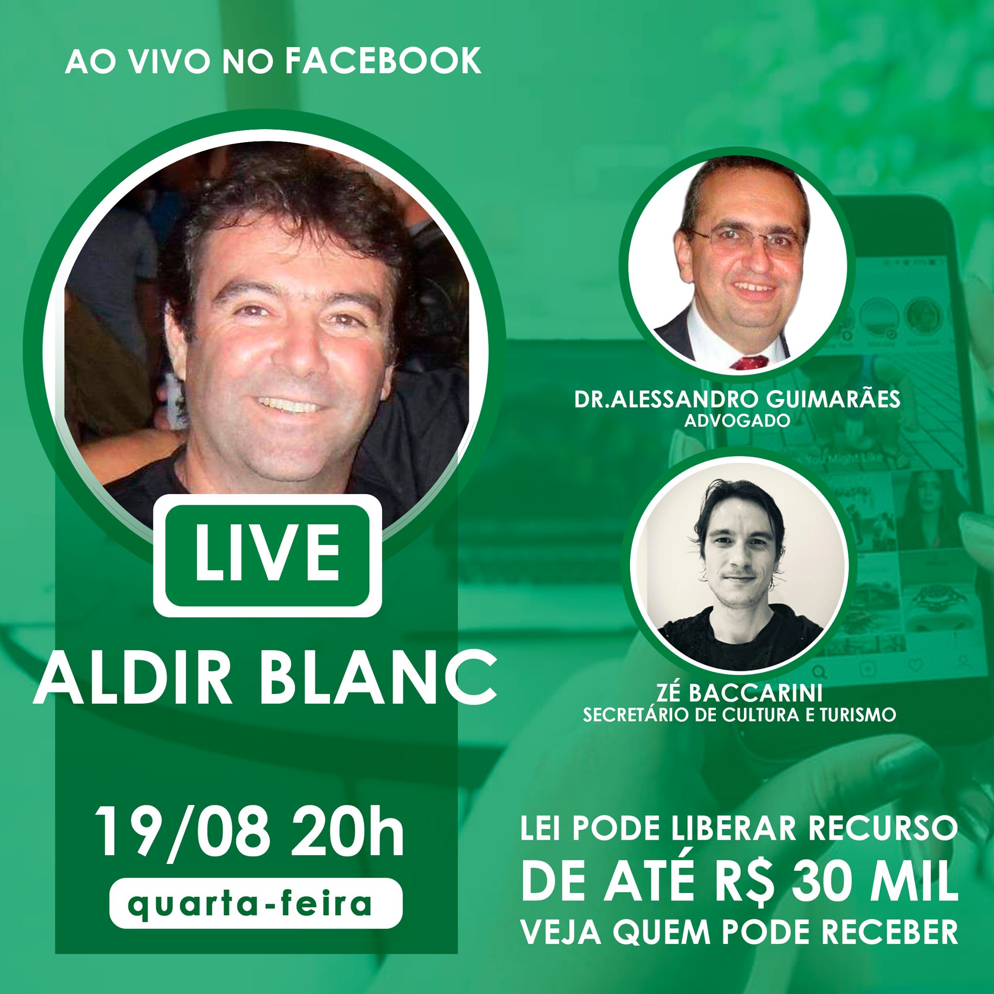 Nesta quarta-feira, dia 19, às 20h, teremos um bate papo em formato de live para tirar todas as dúvidas sobre a Lei Aldir Blanc, que pode liberar até R$ 30 mil reais para artistas e/ou instituições culturais. Venha tirar todas suas dúvidas!