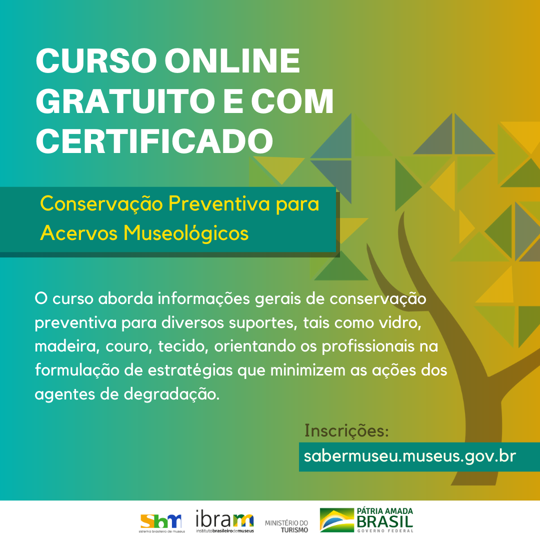 Informações e inscrições https://sabermuseu.museus.gov.br/conservacao-preventiva-acervos-museologicos/?fbclid=IwAR1eR57B3ptEh2GE5s68UkIPmMfdB8TVk09tT4_XX9PX5uvEtH6wJEAR3Hw
