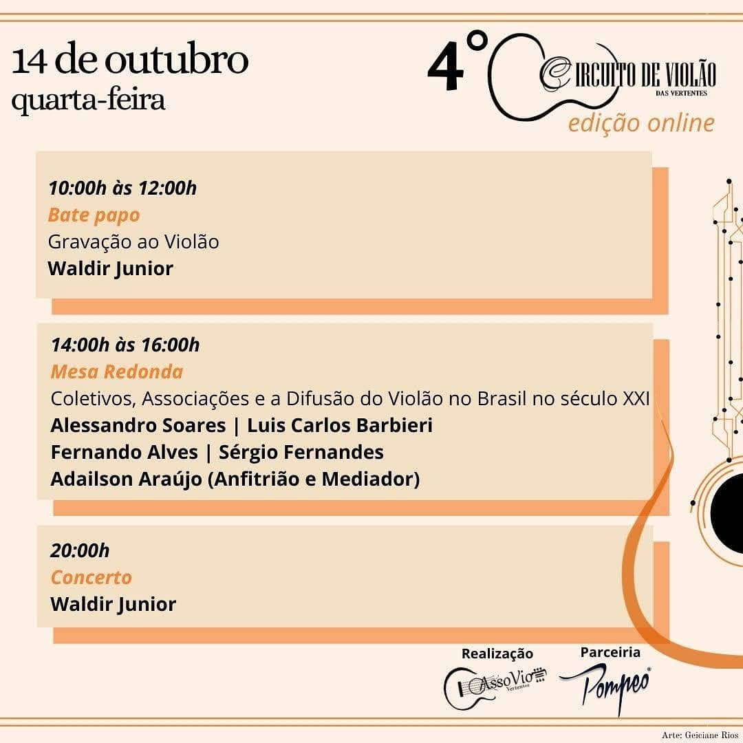 4º Circuito de Violão das Vertentes . Assovio Vertentes . Edição online . Programação 14 de outubro . Ao vivo pelo Youtube . 2020