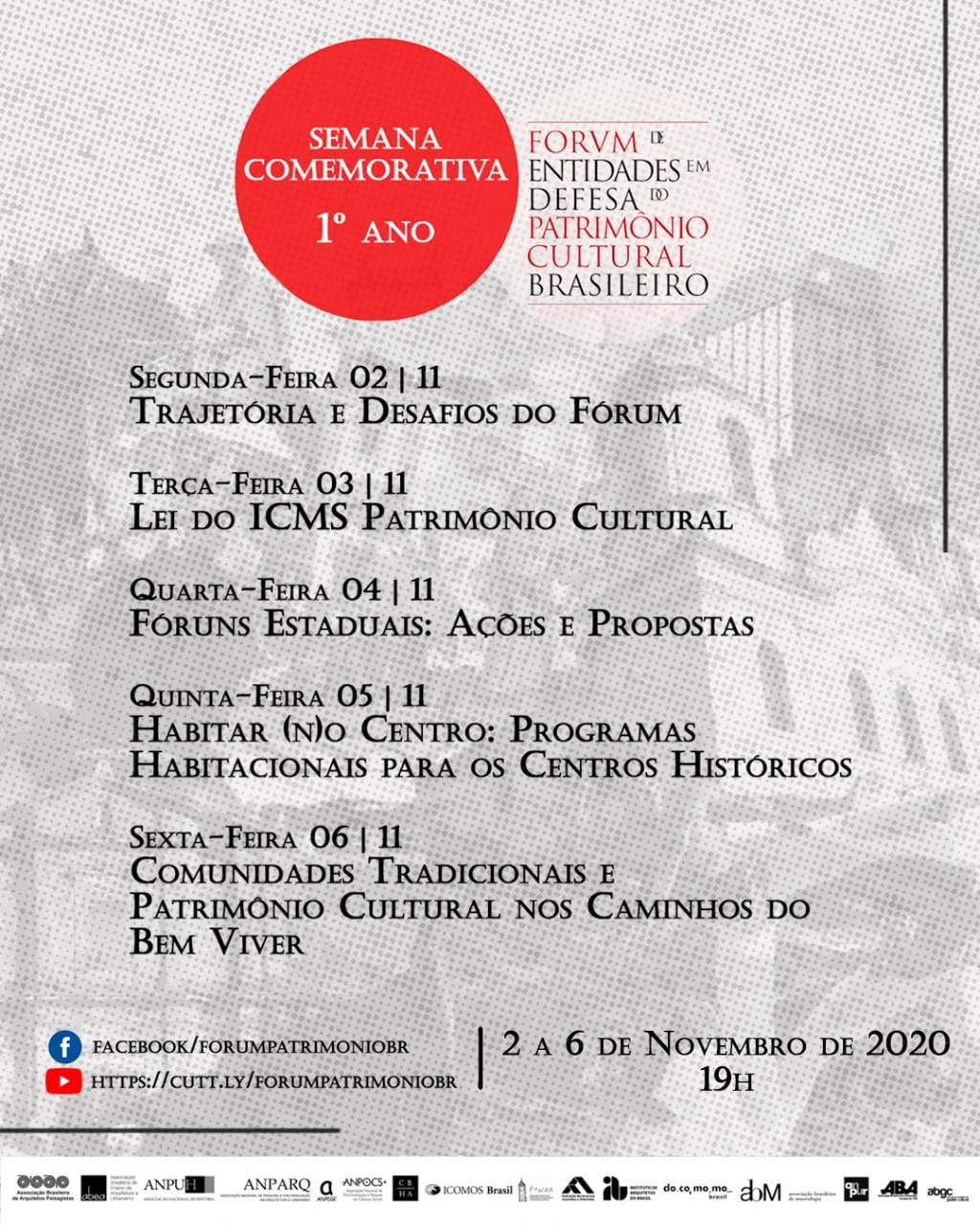 Semana Comemorativa " Fórum de Entidades em Defesa do Patrimônio Cultural Brasileiro" . Programação completa de 02 a 06 de novembro . Ao vivo pelo Youtube . 2020.