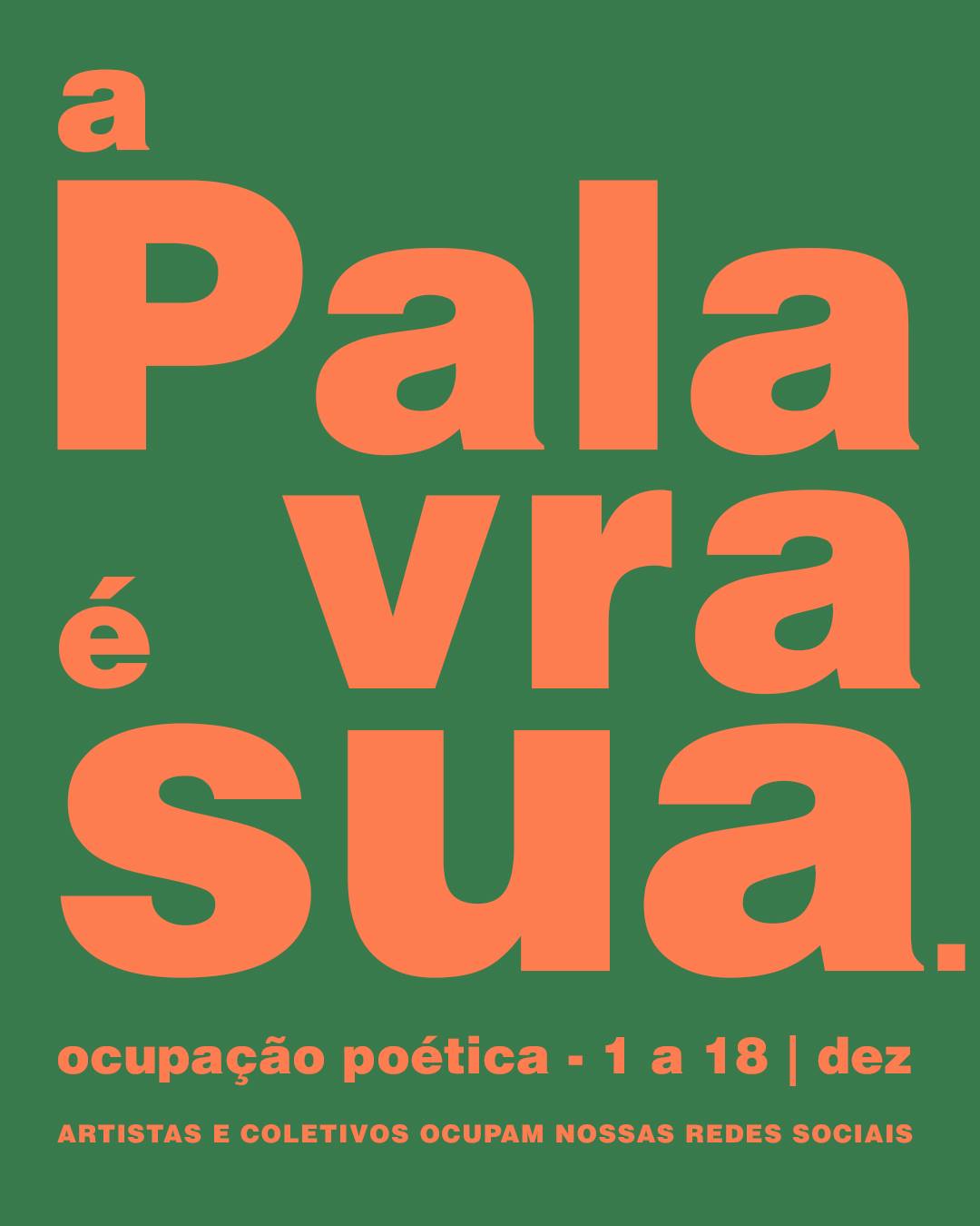 "Ocupação Poética: A Palavra é Sua" no nosso Instagram. Serão 7 artistas/coletivos ocupando a nossa rede por 18 dias. A gente não faz ideia do que vai vir por ai. Deixamos todos a vontade para fazer o seu conteúdo. Zero censura!