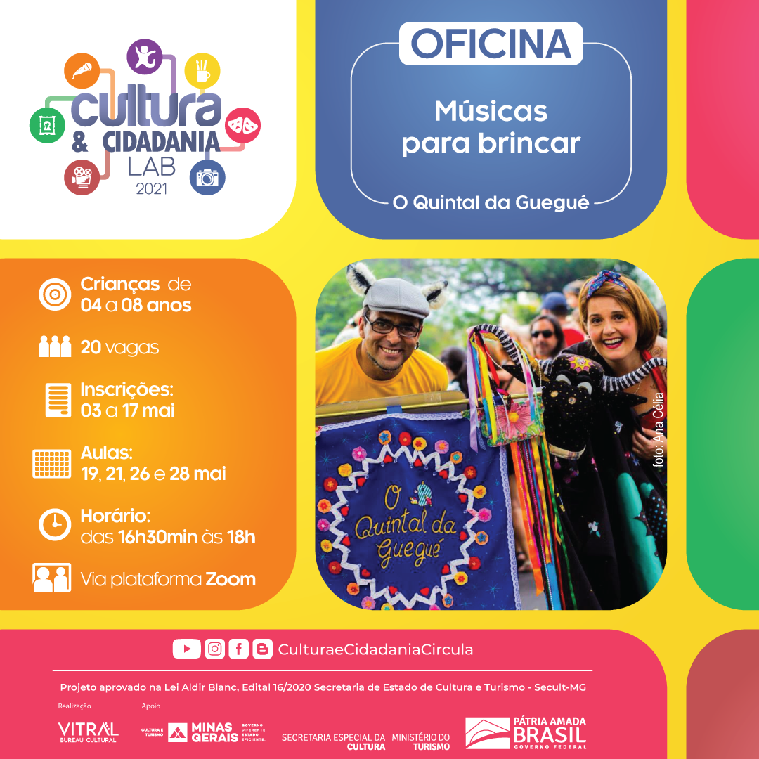 Oficina "Músicas para brincar - O Quintal do Guegué" . Inscrições até 17 de março . Vagas limitadas . Cultura & Cidadania . 2021.