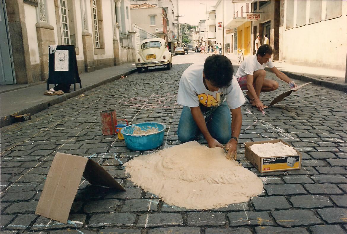 Tapete com o rosto de Tancredo Neves confeccionado por Jaime Vieira, José Ramos, Rita Hilário, Mauro Marques e Carlos Magno de Araújo - entre as palmeiras do Largo São Francisco, por ocasião da morte do Presidente Tancredo Neves . 1985