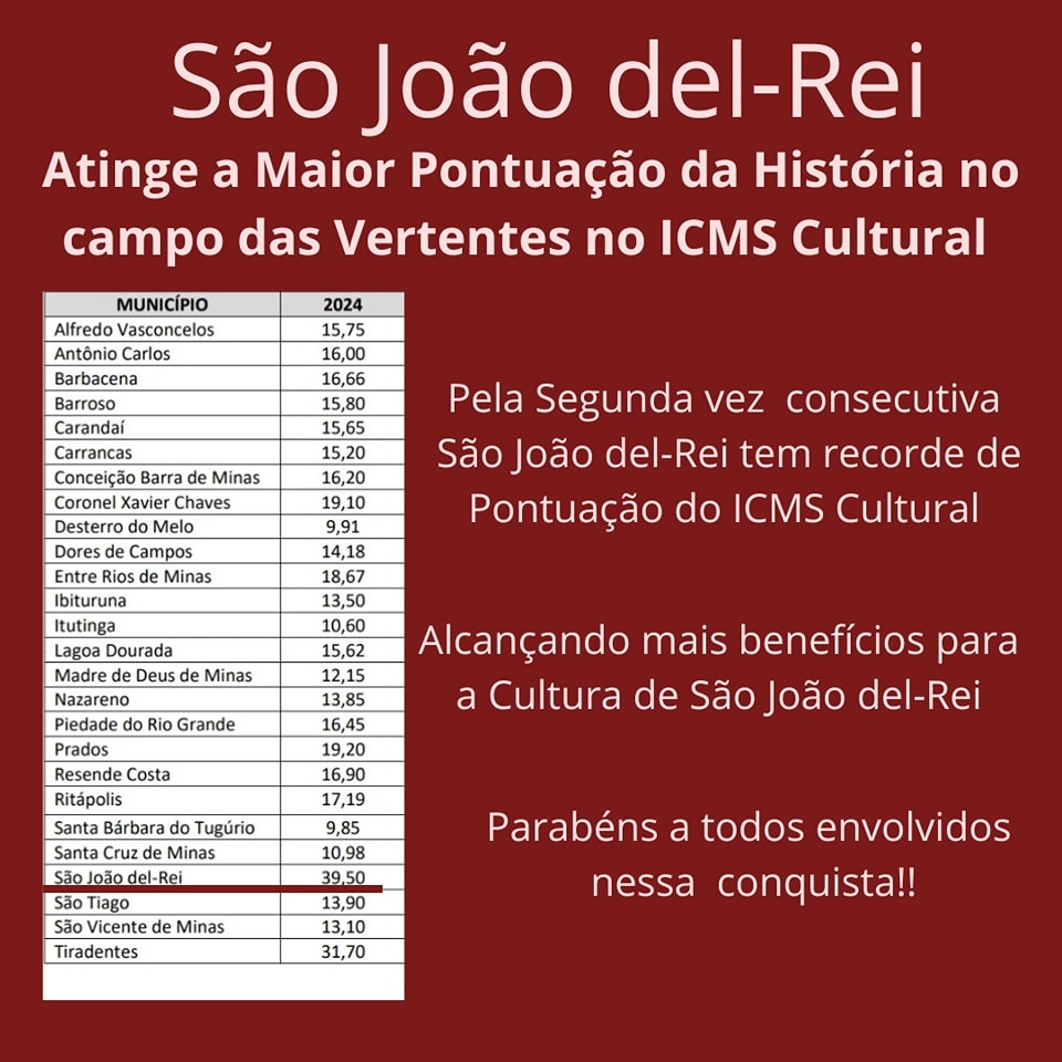 São João del-Rei pelo segundo ano consecutivo atinge a maior pontuação no campo das Vertentes. Captando assim mais recursos para o investimento em nossa Cultura.