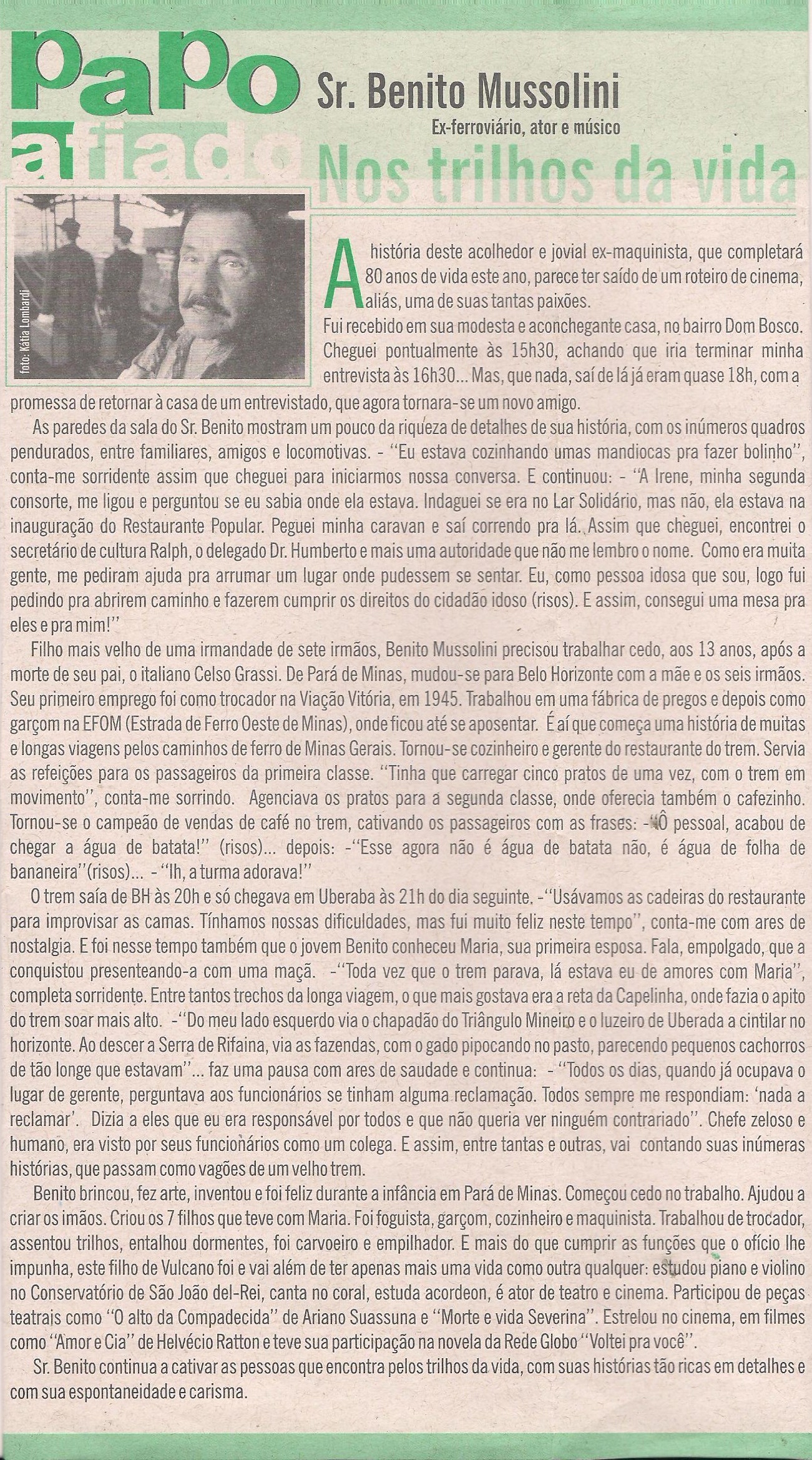 Este texto e a foto que o acompanha poderiam muito bem estar nas páginas de cultura deste jornal. Mas eu quero assinar a emoção, ao falar deste grande homem que foi Benito Mussolini Grassi de Lellis, que subiu para os braços do Senhor na semana passada e que conheci quando eu ainda era criança, em São João Del-Rei, apitando as locomotivas Maria Fumaça que varavam as trilhas do bairro Matozinhos rumo a Tiradentes ou a Avenida Leite de Castro rumo aos sertões ou às Águas Santas.